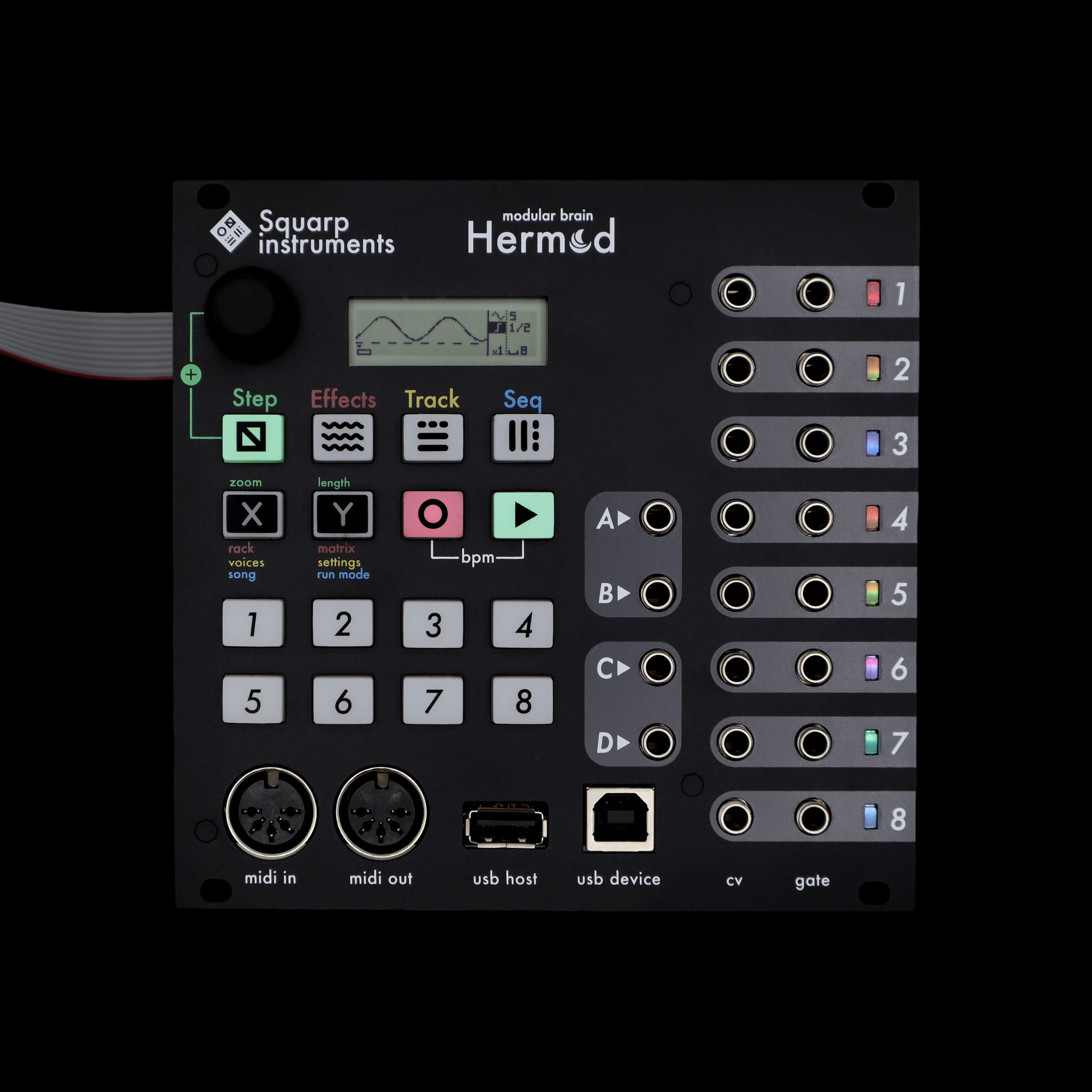 Full connectivity: control Hermod with plug-and-play midi USB devices, midi keyboards, computers or other eurorack CV systems.