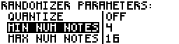 The “rand parameters” submenu allows you to edit the range of the randomizer: quantize grid, number of note range, pitch range, velocity range and length range: