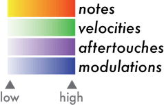 You be able to record events from the MIDI port, the USB host or the USB device port. Hermod always records polyphonic notes and velocities, pitchbend and aftertouch messages, so you can record expressive performances.