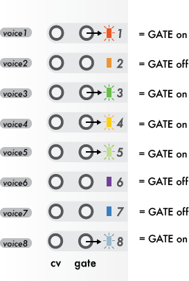 By default, each voices are assigned to output CV note pitch + their associated GATE (each track layout is set to 1 voice, mono).