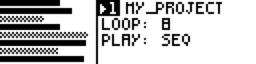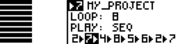 In SEQ mode, the screen will display current project name, sequence loop length, playback mode, the song chain, and a little overview of the tracks currently playing.