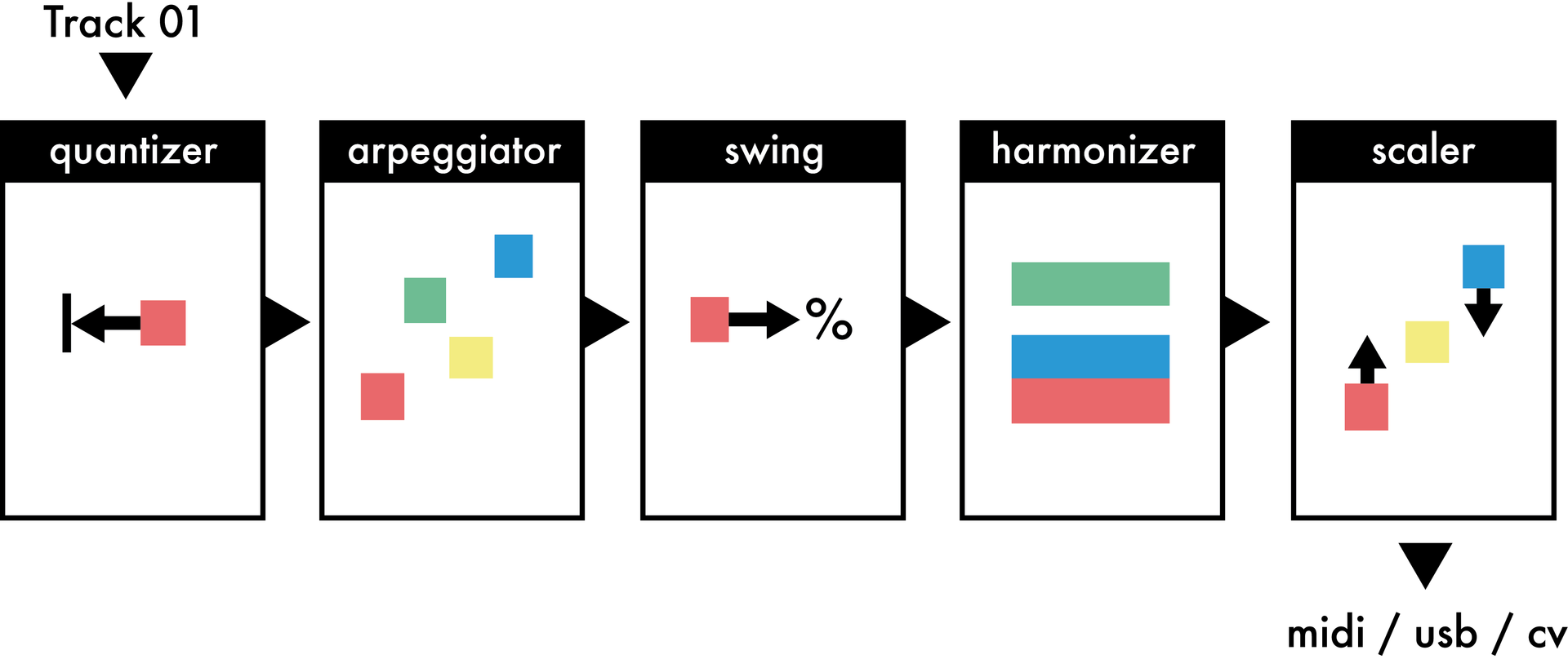 Pyramid integrates state-of-the-art realtime MIDI effects. On each track you can stack 5 powerful effect engines – including quantizer, swing, scaler, delay, equalizer, chance (probability), LFO, randomizer, humanizer, harmonizer, arpeggiator, ...