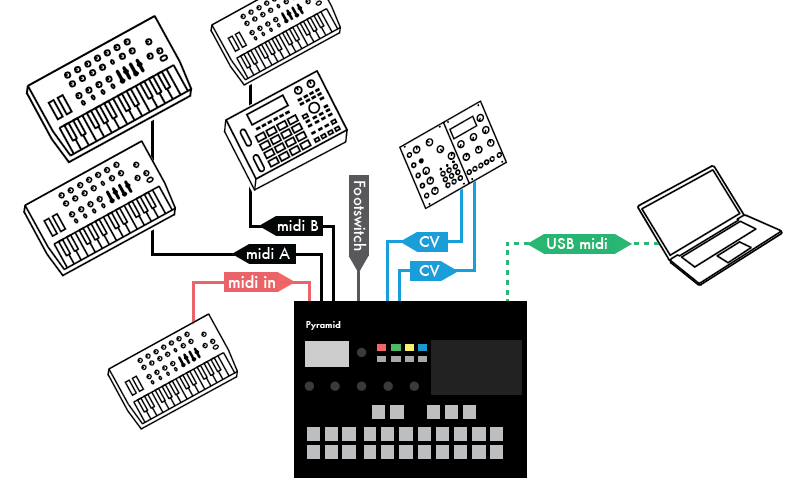 - MIDI in (to control Pyramid with a MIDI controller, multitrack or omni input)