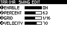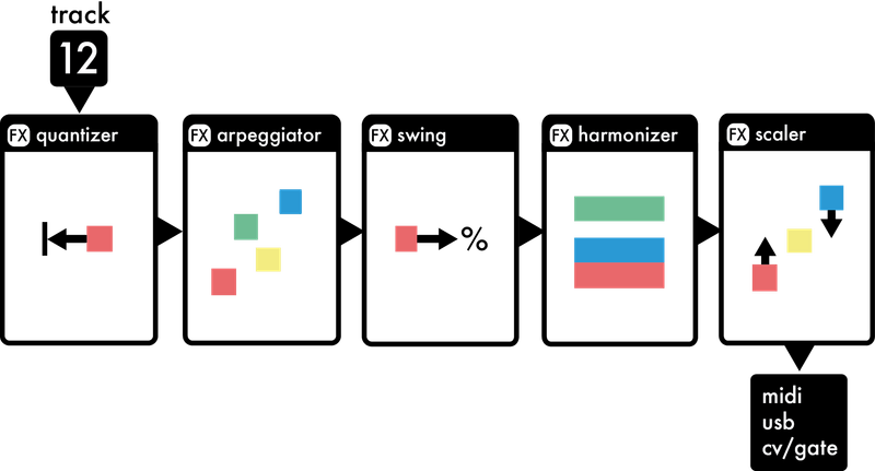 You can add up to 5 real-time MIDI effects per track, from TR01A to TR16D. Notes (played or recorded in LIVE mode, or programmed in STEP mode) are processed and sent to the outputs in real-time by the effect engines. All the effects are non-destructive.