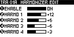 Add an extra note simultaneously with the sequenced note according to the selected interval (harmonic). If HARMO1=12, a note will be generated one octave higher. If HARMO1=NO, no note will be added.
