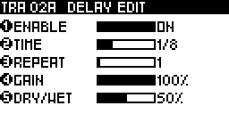 Change the MIDI velocity of each delay note. The velocity of the delay notes will be gradually decreased (gain > 100%) or increased (gain < 100%). If the gain is set to 100% velocity will not change.