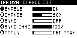 If ”0%”, the note will never be played. If ”50%”, the note has a fifty-fifty chance to be played. If ”99%”, the note will almost always be played. If ”VELOCITY,” the note will have the same probability of being played as its velocity. Very handy for programming different per note probability.