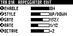 To create octaves progression. If OCTAVE=1 the arpeggiator will play the original pattern, followed by the same pattern one octave higher. If OCTAVE=-2 the arpeggiator will play the original pattern, followed by the same pattern one octave lower, followed by the same pattern two octaves lower.