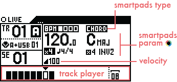 Press DISP to display the generated chords for the 8 smartpads and the currently recorded notes: