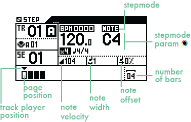 When you hold a step (or when you hold two steps to select a row of steps), the screen displays the note parameters of the selection: