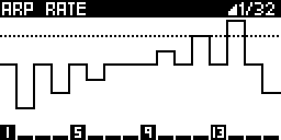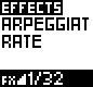 ARPEGGIATOR effect : RATE parameter is selected, the current parameter value is 1/32 (if you press a step, a rate=1/32 message will be added)