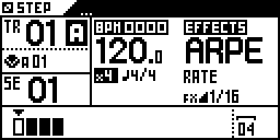 ARPEGGIATOR effect : RATE parameter is selected, the current parameter value is 1/32 (if you press a step, a rate=1/32 message will be added)