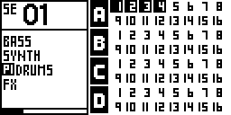Press DISP to display all active tracks in the current sequence. A list will also display up to 5 active tracks names + patterns numbers: