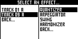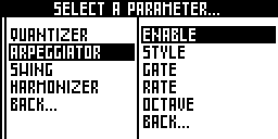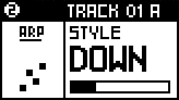 When an assigned encoder is moved or pressed, a popup is displayed displaying the effect (ARP), the effect parameter (STYLE), the effect value (DOWN), and the effect track (01A):