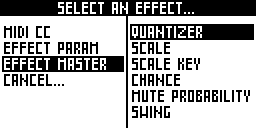 You can change with a single control the Quantizer GRID, the Scale SCALE, the Scale KEY, the Chance CHANCE or the Swing PERCENT of all tracks. For example, if you assign an encoder to the MASTER SWING, the Swing parameter PERCENT will be affected on each track containing a Swing effect. We also added the Mute PROBABILITY, allowing you to change the probability (from 0% to 100%) of a muted note to be played.