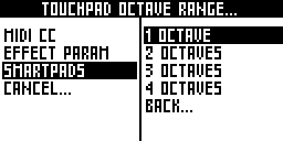 For example, if LIVE smartpads = SCALE, X axis = 2 OCTAVES and Y axis = VELOCITY, slide the touchpad X to play notes (in the selected scale) and the touchpad Y to change notes velocity.