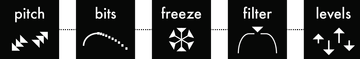 - each voice has a 5–effect rack: bitcrusher, pitch (6–pole interpolator), filter, freeze, drive