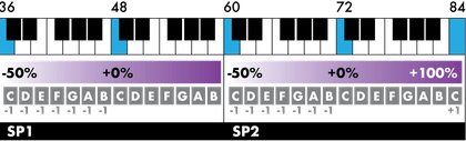 Second example, if you set SP1 = 36 48 60 and SP2 = 60 72 84, your midi keyboard will be split into 2 parts:
