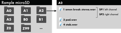 Use the gate input 1 to play SP1 (sample 1), gate input 2 to play SP2, gate input 3 to play SP3, gate input 4 to play SP4.