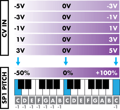 Instead of assign CV IN to linear pitch (–5V = –50%, 0V = 0%, 5V = +100%) it's possible to use the standard V/OCTAVE to pitch sample with quantized chromatic notes. To do so, select "v/oct" in the CV INPUT assign list.