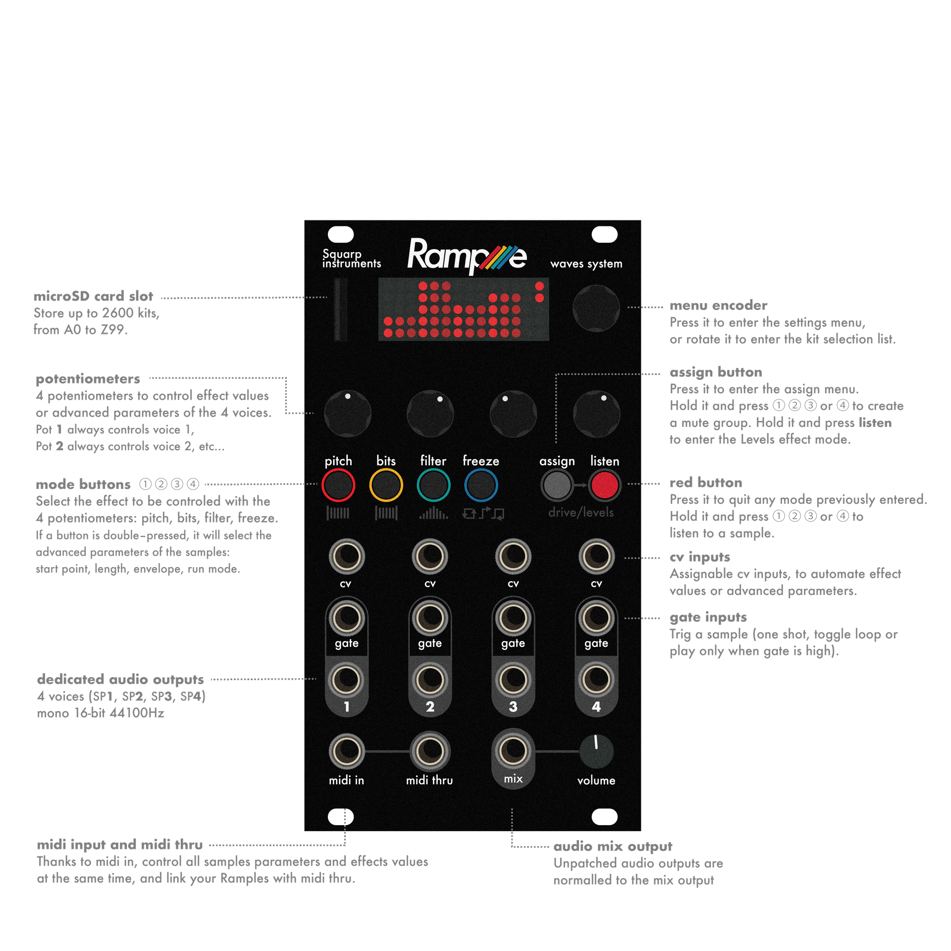 ● freeze — when enabled (pot ≠ midpoint), Rample will sample and loop a fraction of the played waveform, creating a glitching effect: