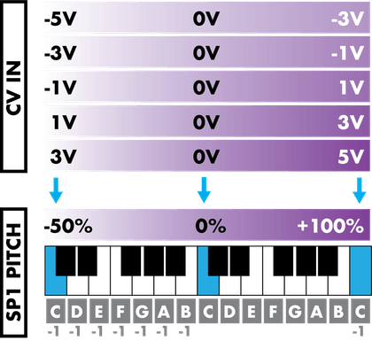 Instead of assign CV IN to linear pitch (–5V = –50%, 0V = 0%, 5V = +100%) it's possible to use the standard V/OCTAVE to pitch sample with quantized chromatic notes. To do so, select "v/oct" in the CV INPUT assign list.