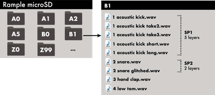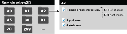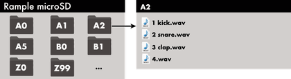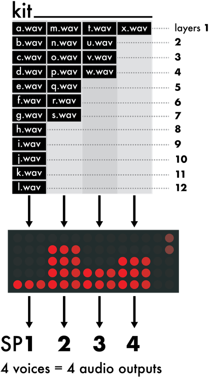 Each kit folder includes up to 12 samples (.wav file) per voice. There are 4 voices: audio outputs SP1, SP2, SP3 and SP4.