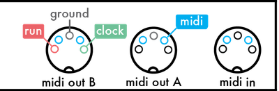 The DIN sync output is available on MIDI out B, routed as following: